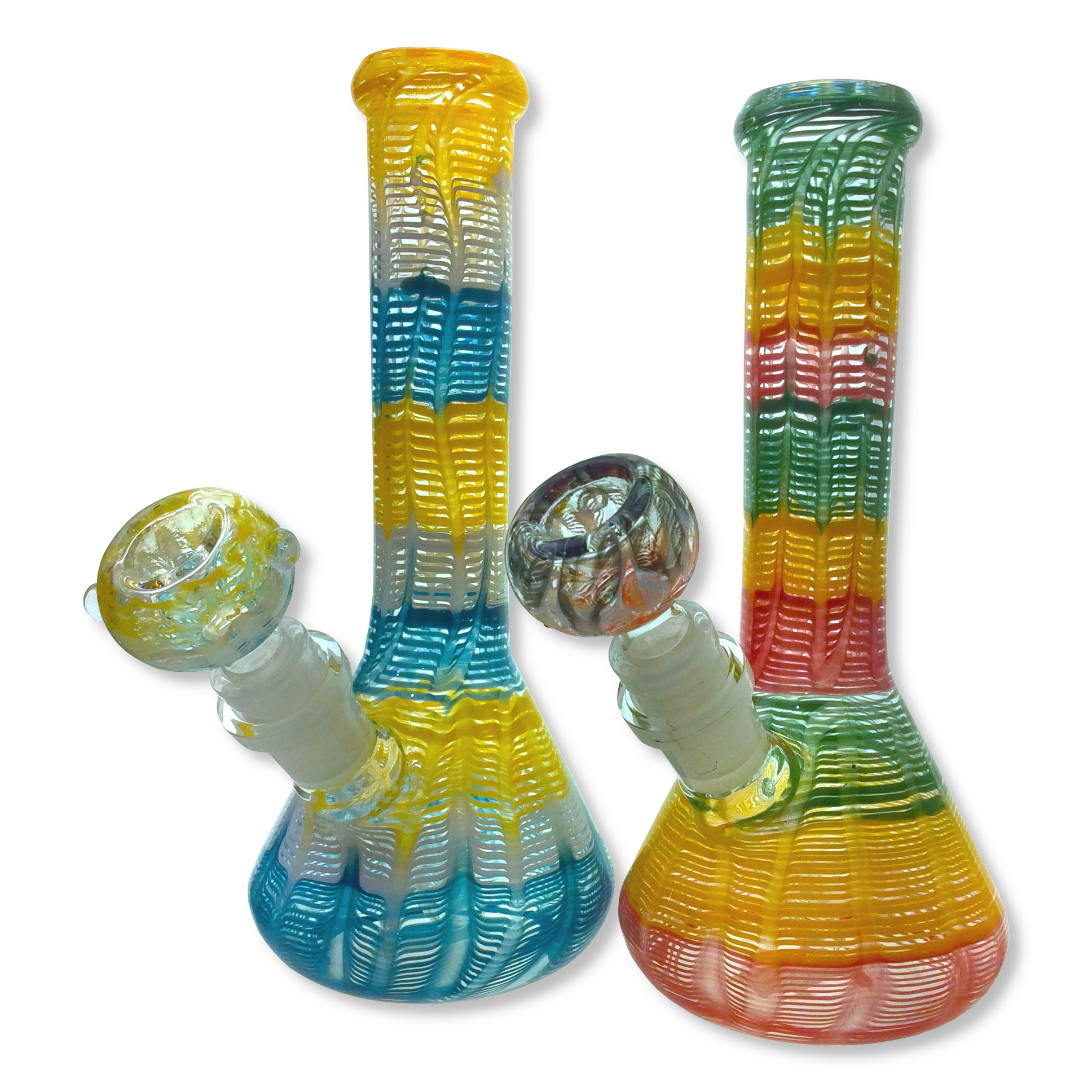 8 INCH FANCY SWIRL GLASS ON GLASS BEAKER WATER PIPE