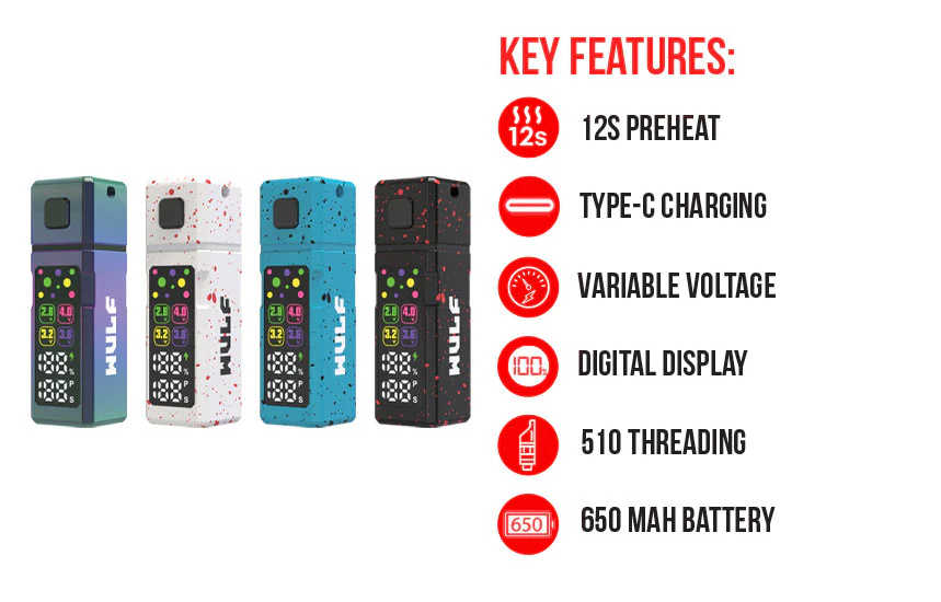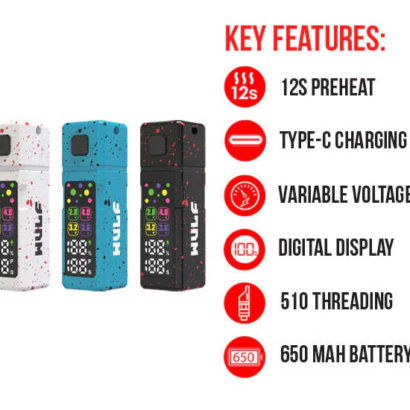 Take a look at the 10 different colors including black-red spatter, full color, and more – to unlock your clouds and take your sessions off the grid, all with your own Wulf Mods Grid 510 Variable Voltage Battery.