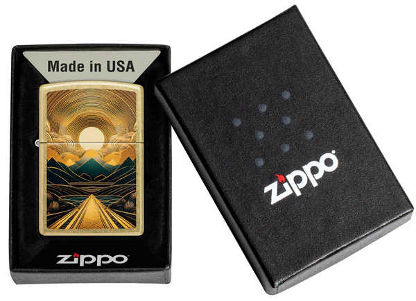 Travel off into the sunset with this classic Street Brass lighter. The stunning Color Image design depicts a stylized mountain road that leads toward a brilliant setting sun. Comes packaged in a gift box. For optimal performance fill with Zippo lighter fuel.